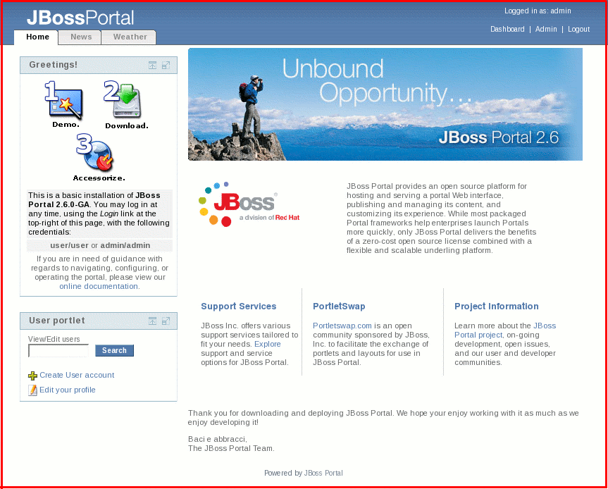 org.jboss.portal.header.USER: A org.jboss.portal.identity.User object of the logged-in user, null if the user is not logged-in.org.jboss.portal.header.LOGIN_URL: URL to logging-in.org.jboss.portal.header.DASHBOARD_URL: URL to the dashboard, null if the user is already on the dashboard, null if the user is on the default portal already.org.jboss.portal.header.DEFAULT_PORTAL_URL: URL to the default page of the portal named 'default', null if the user is on the default portal already.org.jboss.portal.header.ADMIN_PORTAL_URL: URL to the default page of the admin portal (named 'admin'), null if the user is on the admin portal already.org.jboss.portal.header.EDIT_DASHBOARD_URL: URL to the page content editor of the dashboard, set only if the user is on the dashboard, null otherwise.org.jboss.portal.header.COPY_TO_DASHBOARD_URL: URL to copy a page from a portal to the personal dashboard, null if the user is on the dashboard.org.jboss.portal.header.SIGN_OUT_URL: URL to log out the portal.Every attribute that is an URL attribute is an object implementing the org.jboss.portal.api.PortalURL interface. Therefore it is possible to generate the URL using the toString() method and change various things related to the URL. With that in hand, if someone just wanted to display the logged-in username and a link to log out, he could write: