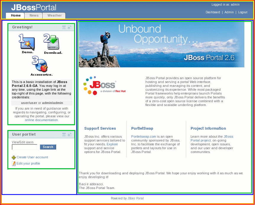 JBoss Portal has the concept of regions on a page. When a page is defined, and portlet windows are assigned to the page, the region, and order inside the region, has to be specified as well. For portal layouts this has significant meaning. It defines the top most markup container that can wrap portlet content (other then the static markup in the JSP itself). In other words: from a layout perspective all portlets of a page are assigned to one or more regions. Each region can contain one or more portlets. To render the page content to return from a portal request, the portal has to render the layout JSP, and for each region, all the portlets in the region.