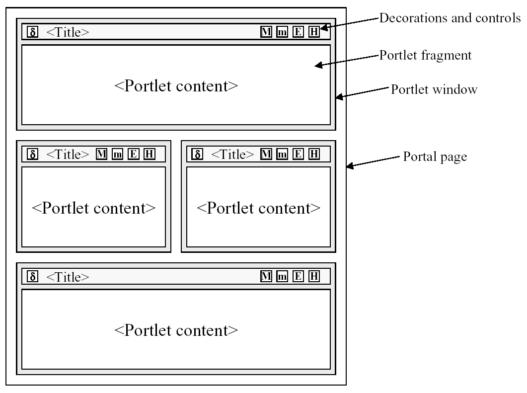 A portal can be seen as pages with different areas, and inside areas, different windows, and each window having one portlet: