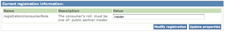Suppose now that we would like to upgrade our service level to the "insider" level. We will need to tell BEA's producer that our registration data has been modified. Let's see how to do this. Assuming you have configured access to the producer as previously described, please go to the configuration screen for the bea producer and modify the value of the registration/consumerRole to insider instead of public: