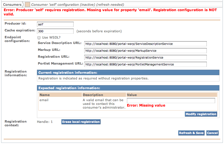 Now suppose that the administrator of the producer now requires a value to be provided for an email registration property. We will actually see how to do perform this operation in JBoss Portal when we examine how to configure Portal's producer in Section 15.8, “Configuring JBoss Portal's WSRP Producer”. Operations with this producer will now fail. If you suspect that a registration modification is required, you should go to the configuration screen for this remote producer and refresh the information held by the consumer by pressing "Refresh & Save":