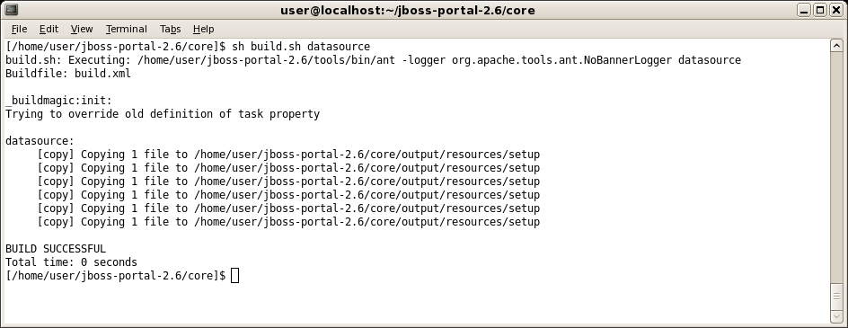 4. Change into the JBOSS_PORTAL_SOURCE_DIRECTORY/core/ directory, and run the sh build.sh datasource command, or, if you are running Windows, run the build.bat datasource command: