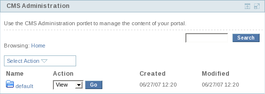 Viewing the CMSAdmin Portlet is accomplished by logging in as an admin (admin/admin) and navigating to the admin portal and then the CMS Page tab.