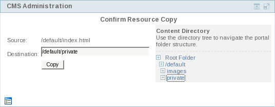 The copy resource window allows a user to copy files to any folder on the system, as well as copy whole directory trees to any directory on the system. A user can select which destination directory to copy the resource to, by using the directory browser. Clicking the