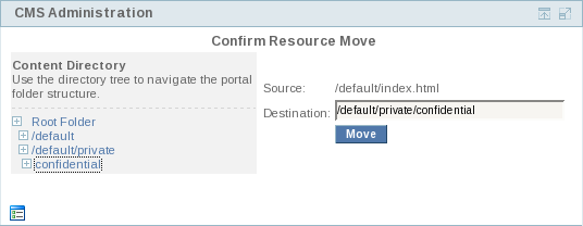 The move resource window allows a user to move files to any folder on the system, as well as move whole directory trees to any directory on the system. A user can select which destination directory to move the resource to, by using the directory browser. Clicking the