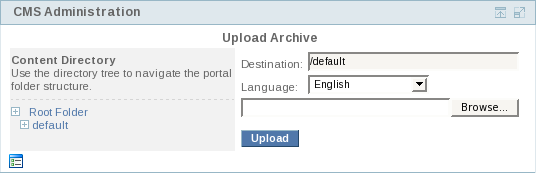 icon expands the directory tree. Clicking on the name of the directory within the tree, sets it as the destination directory for the uploaded resource. Additionally, a user can set a title for the file that will be used in the portlet title bar, and a language for the file, used in serving localized content.