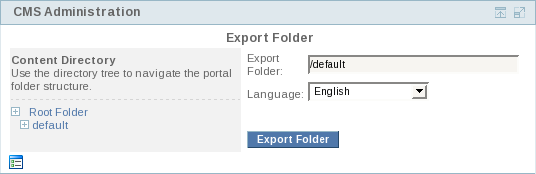The export folder window allows a user to export entire directory structures as zip files. The system will aggregate all contents of a specific directory, and present to the user to download it. A user can select which source directory to export the resources from, by using the directory browser. Clicking the