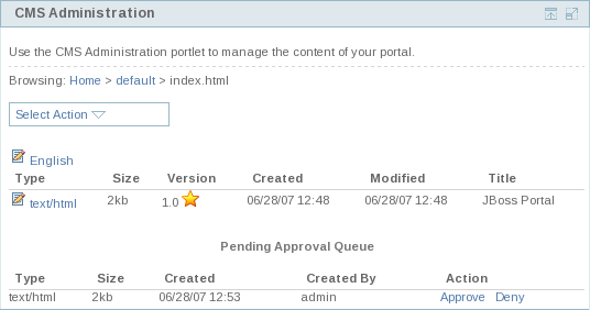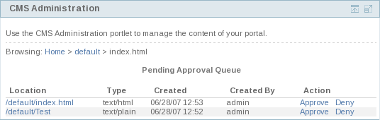 When a content is created in the CMS, the screen should show an Pending Queue of Approvals for that particular content as shown below in the screen. The content waiting in this queue is not accessible for "Live" usage.