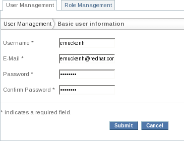 This chapter covers the administrator functions made available by the User management portlet. For end-user operation, see: Section 1.2.3.2, “Identity User Portlet”. Administrative functions are available once you are logged in with the proper credentials (admin/admin), then going to the Section 1.4, “Admin Portal” and then the Members Page tab. You can change between user and role management by clicking on the corresponding links in the top of the portlet.