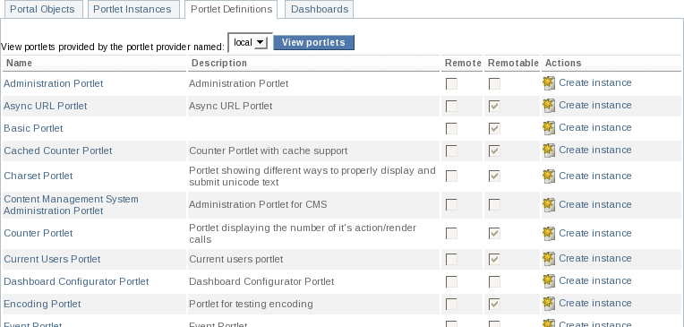 local: this is Portal's portlet container. Any successfully deployed portlet will appear in the list of available portlet definitions for this provider.