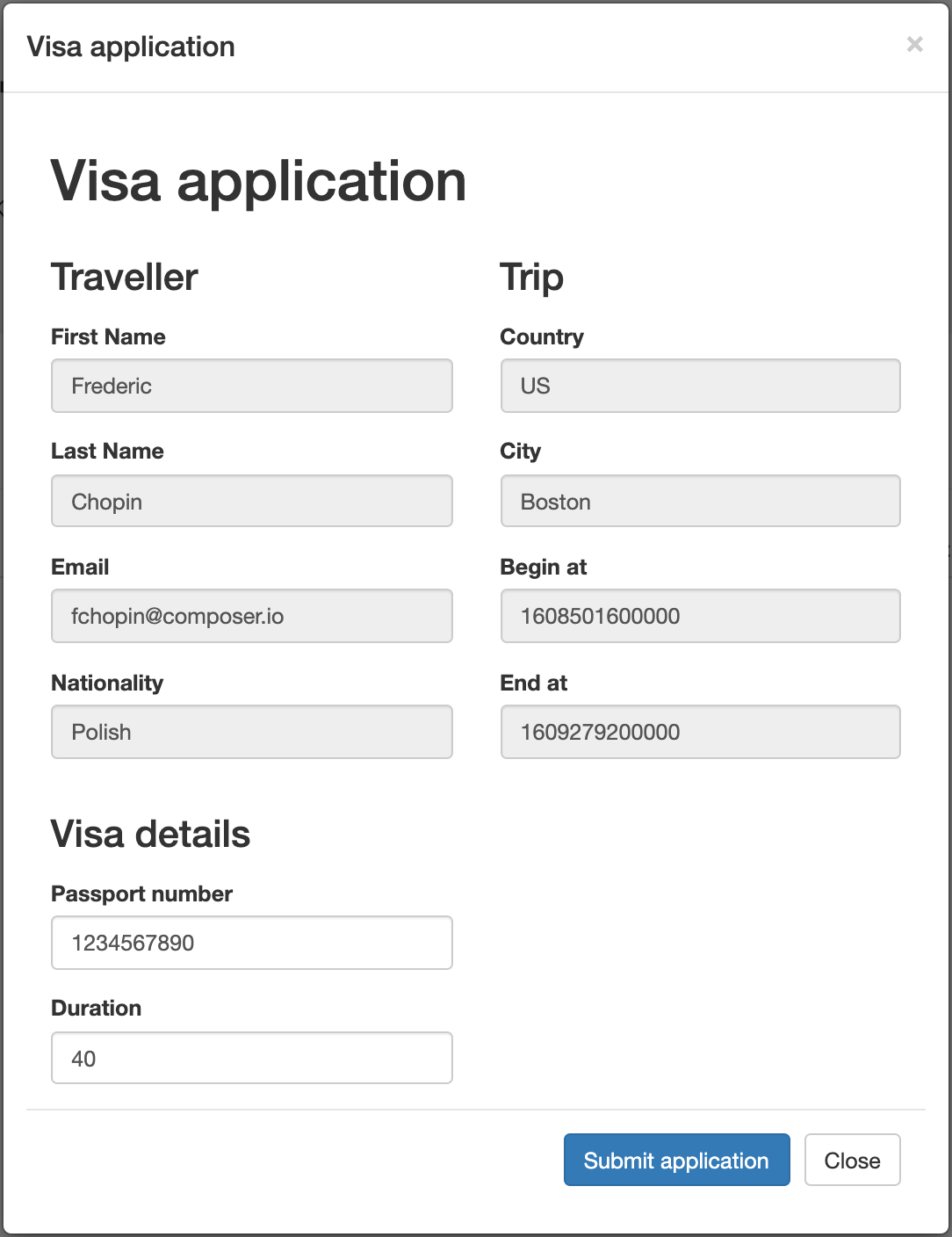 Example requestcurl -X POST http://localhost:8080/orders -H 'content-type: application/json' -H 'accept: application/json' -d '{"approver" : "john", "order" : {"orderNumber" : "12345", "shipped" : false}}'Example response{"approver":"john","id":"6b53c227-6d5e-40b7-8c8c-a541a2a47d58","order":{"orderNumber":"12345","shipped":false,"total":0.3845152065899532}}The new order has an