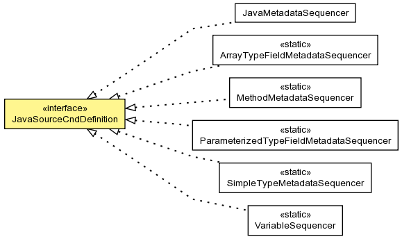 - ArrayTypeFieldMetadataSequencer, JavaMetadataSequencer, MethodMetadataSequencer, ParameterizedTypeFieldMetadataSequencer, SimpleTypeMetadataSequencer, VariableSequencer