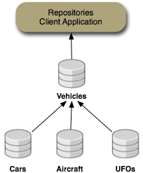 The repository example consists of a client application that sets up three ModeShape repositories (named "Cars", "Airplanes", and "UFOs") and a federated repository ("Vehicles") that dynamically federates the information from the other three repositories. The client application allows you to interactively navigate each of these repositories just as you would navigate the directory structure on a file system.