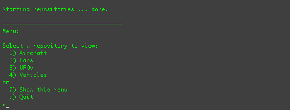 If you were to select the "Cars" repository and use some of the commands, you should see something similar to: