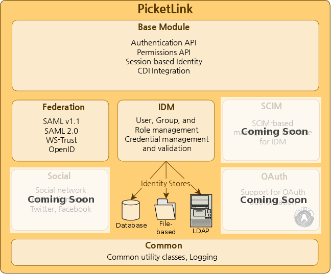 The base module provides the integration framework required to use PicketLink within a Java EE application. It defines a flexible authentication API that allows pluggable authentication mechanisms to be easy configured, with a sensible default authentication policy that delegates to the identity management subsystem. It provides session-scoped authentication tracking for web applications and other session-capable clients, plus a customisable permissions SPI that supports a flexible range of authorization mechanisms for object-level security. It is also the "glue" that integrates all of the PicketLink modules together to provide a cohesive API.
