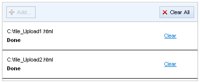 Automatically files uploading could be performed by means of the "immediateUpload" attribute. If the value of this attribute is "true" files are uploaded automatically once they have been added into the list. All next files in the list are uploaded automatically one by one. If you cancel uploading process next files aren't started to upload till you press the "Upload" button or clear the list.