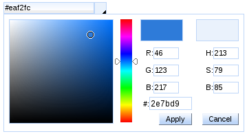 The <rich:colorPicker> component lets you visually choose a color or define it in hex, RGB, or HSB input fields.