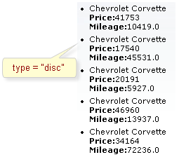 <rich:dataList var="car" value="#{dataTableScrollerBean.allCars}" rows="5" type="disc" title="Car Store">
