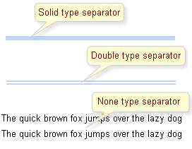 <rich:separator> is a simple layout component, which represents a separator stylized as a skin. Thus, the main attributes that define its style are "style" and "styleClass". In addition there are "width" and "height" attributes that should be specified in pixels. On the HTML page the component is transposed into HTML <div> tag.