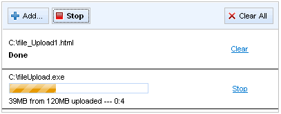 Automatically files uploading could be performed by means of the "immediateUpload" attribute. If the value of this attribute is "true" files are uploaded automatically once they have been added into the list. All next files in the list are uploaded automatically one by one. If you cancel uploading process next files aren't started to upload till you press the "Upload" button or clear the list.