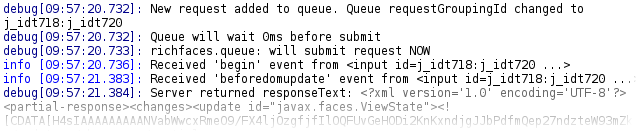 level="ERROR" to log all errors.level="FATAL" to log only fatal messages.level="INFO" to log only informational messages.level="WARN" to log only warning messages.level="ALL" to log all data. This is the default setting.The log is automatically renewed after each Ajax request. It does not need to be explicitly re-rendered. To clear previous requests, implement a Clear button or similar functionality.