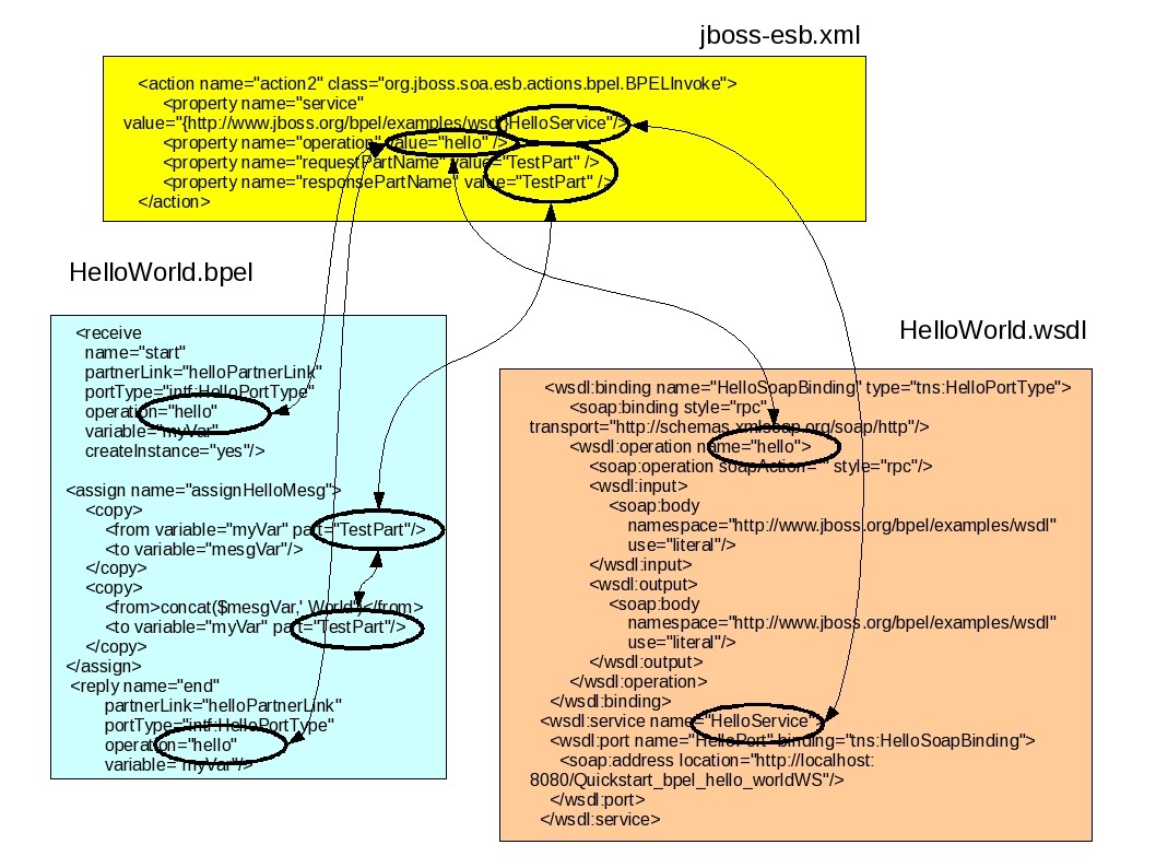 The following diagram illustrates the inter-relationship of the JBossESB bpel_helloworld quickstart and the RiftSaw BPEL process configuration files.