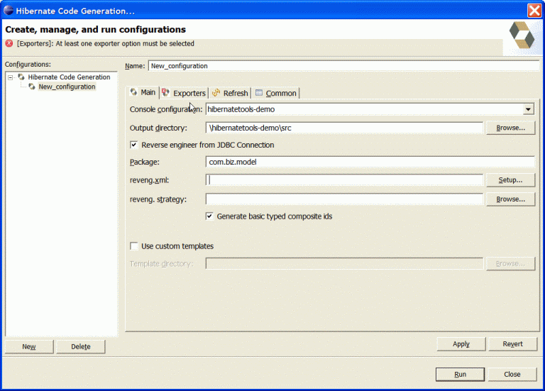 Reverse engineer from JDBC Connection | If enabled the tools will reverse engineer the database available via the connection information in the selected Hibernate Console Configuration and generate code based on the database schema. If not enabled the code generation will just be based on the mappings already specified in the Hibernate Console configuration. |