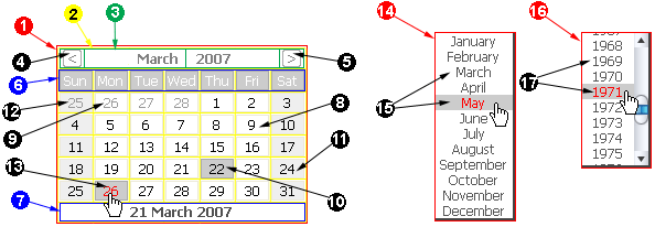 Example ![]() CSS Styling The following list describes the CSS class names that are used to control the style of the selectDate control.