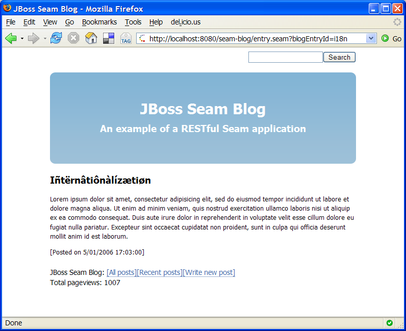 When the entry.xhtml page is requested, Seam first binds the page parameter blogEntryId to the model, then runs the page action, which retrieves the needed data—the blogEntry—and places it in the Seam event context. Finally, the following is rendered: