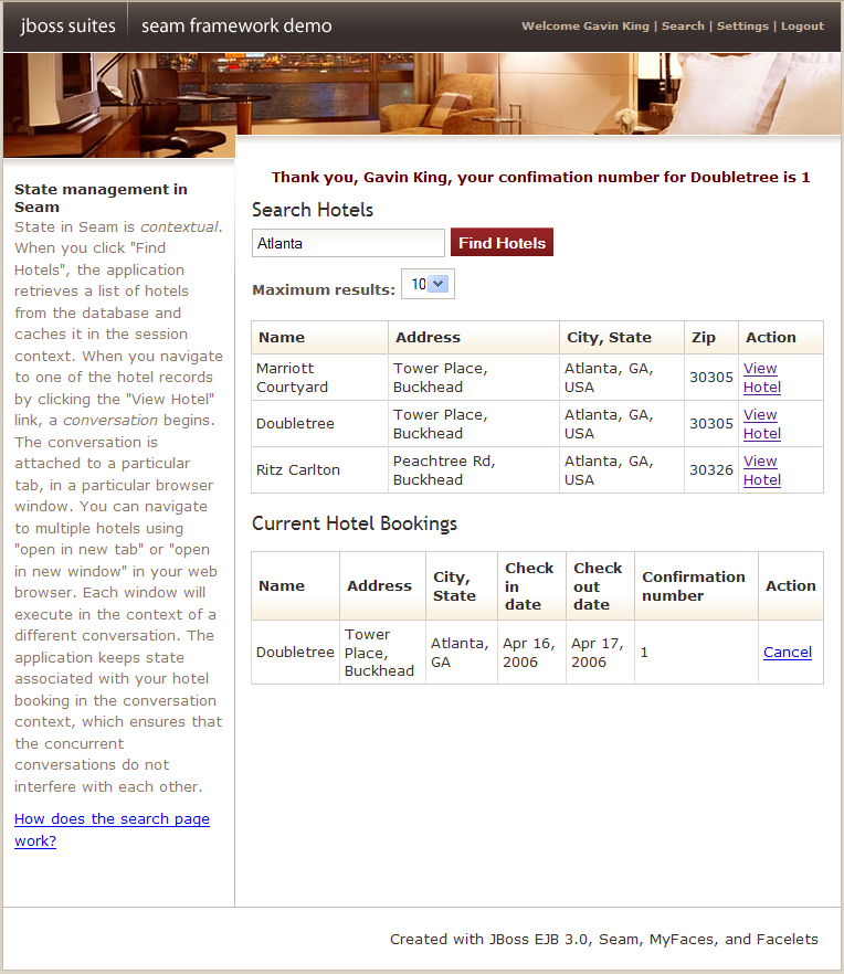 The registration example is a fairly trivial application that lets a new user store his username, real name and password in the database. The example isn't intended to show off all of the cool functionality of Seam. However, it demonstrates the use of an EJB3 session bean as a JSF action listener, and basic configuration of Seam.