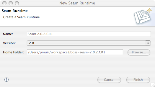 The first step here is to tell JBoss Tools about the Seam download you want to use. Add a new Seam Runtime - make sure to give it a name, and select 2.0 as the version: