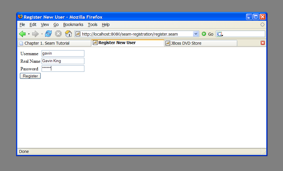 L'esempio di registrazione è una semplice applicazione per consentire all'utente di memorizzare nel database il proprio username, il nome vero e la password. L'esempio non vuole mostrare tutte le funzionalità di Seam. Comunque mostra l'uso di un EJB3 session bean come JSF action listener e la configurazione base di Seam.