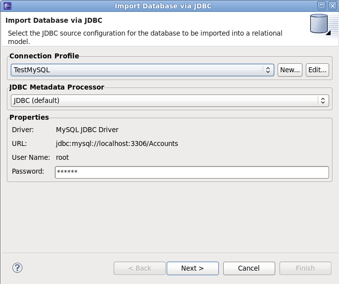 On this page, select the 'TestMySQL' Connection profile that you created in the previous step. Click Next.
