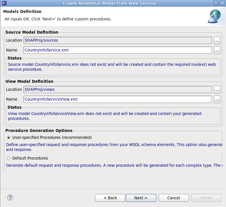 Follow the wizard to create a new Model Project. For this example, we will use SOAPProj for our project name. On the second page of the wizard, select the 'sources' and 'views' folders. Click Finish. The new project is created.
