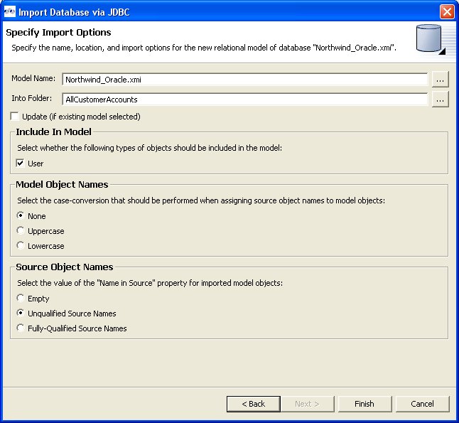 Step 7 - On the Specify Import Options page, specify desired Model Name as well as any other options used to customize the constructed relational objects. Press Finish> to complete.