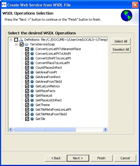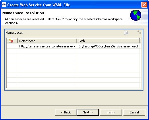 Step 4 - The next page is titled Namespace Resolution. This page identifies successful and errant WSDL namespace resolution. The main WSDL document will essentially always be resolved, since the workspace file chooser is used to obtain the path. Problems will occur when the main WSDL file imports other WSDL files that cannot be resolved. If no errors, select Next to proceed, or Finish (if enabled) to complete with default options.