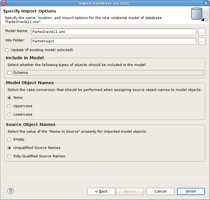 Step 7 - On the Specify Import Options page, specify desired Model Name as well as any other options used to customize the constructed relational objects. Press Finish> to complete.