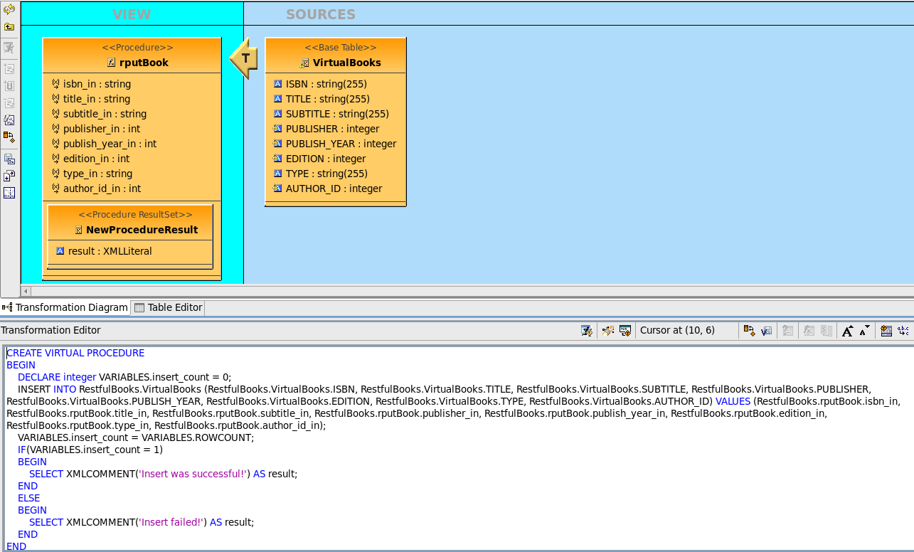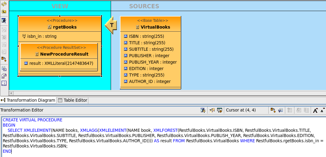 Step 1 - In a virtual model, add a procedure(s) that returns an XMLLiteral object. The target of your procedure can be any models in your VDB. Here is an example procedure that selects from a virtual table (VirtualBooks) and returns the results as an XMLLiteral: