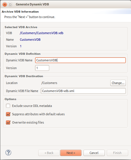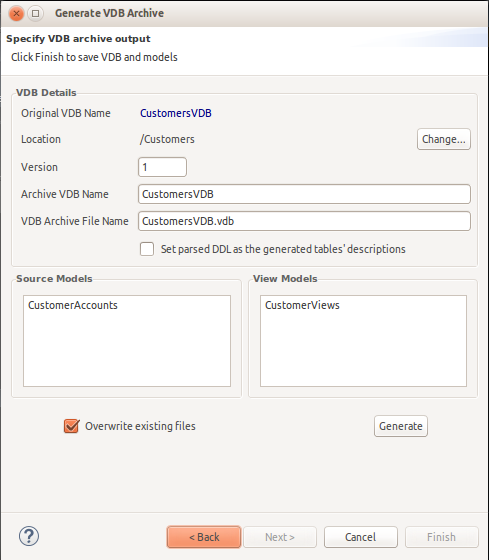 Step 4 - On the second page, specify details and options for yor VDB archive including actual VDB name, VDB archive file name and target location (project or folder). Click Generate to create the VDB archive and associated models in your target location. Then click Finish