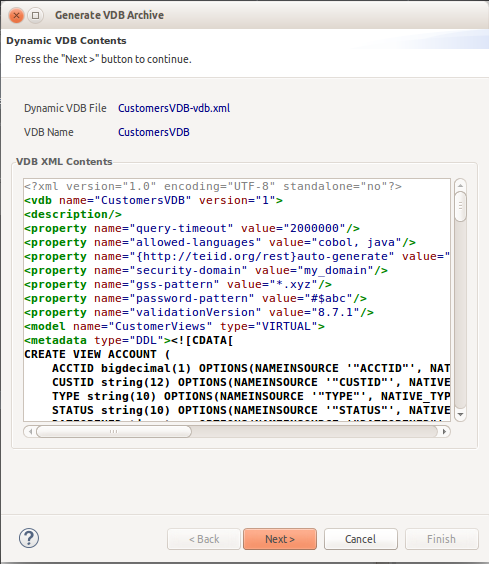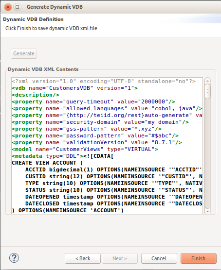 Step 3 - On the second page, click the Generate button. The XML contents will be displayed in the viewer which represents the same basic metadata from the origional VDB. Click Generate to create the VDB archive and associated models in your target location. Then click Finish to save the XML string to the file specified in Step 2.