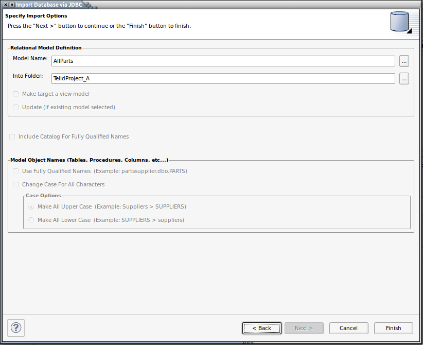 The wizard will detect that the connection profile is a Teiid VDB connection and a section will be displayed on the wizard page titled Teiid VDB Source Options