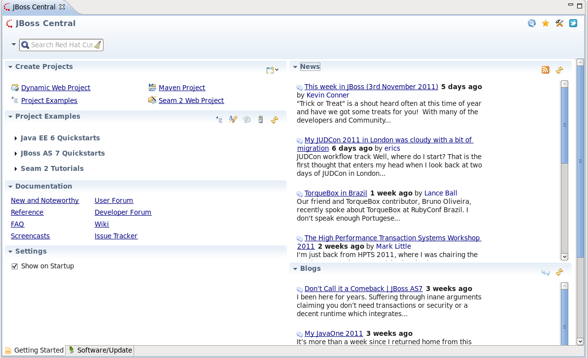 When starting the JBoss Developer Studio you will see JBoss Central in the workspace. From JBoss Central you can quickly Create Projects, run Project Examples, view Documentation, read the latest News and Blogs, and change JBoss Central Settings.