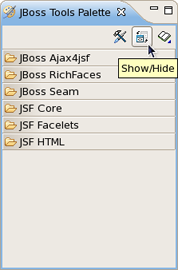 By default the Palette is represented in Web Development Perspective with four groups. If you can't see it, select Window > Show View Other... > JBoss Tools Web > JBoss Tools Palette from the menu bar.