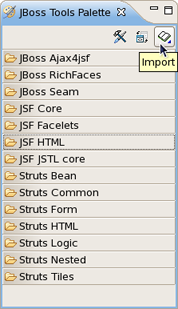 The Import button lets you add a custom or 3rd party tag library to JBoss Tools Palette. Find out more information on how to add particular tags see the Adding Custom JSF Tags section.