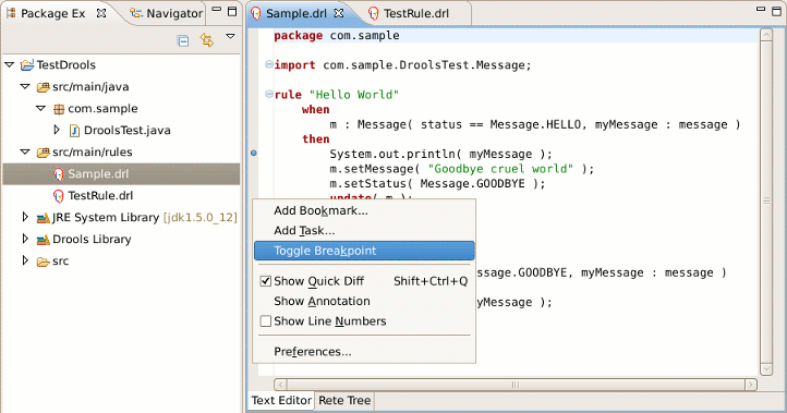 To create breakpoints in the Package Explorer view or Navigator view of the Drools perspective, double-click the selected .drl file to open it in the editor. In the example below we opened Sample.drl file.