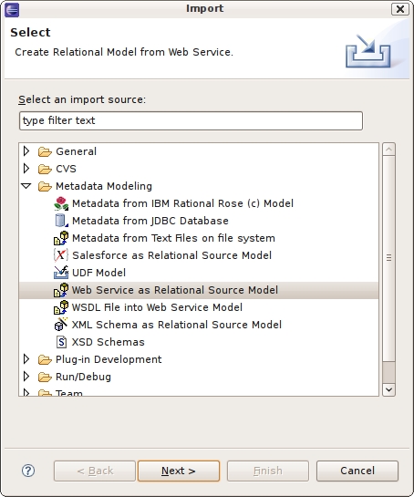 Step 2 - Select the import option Metadata Modeling > Web Service as Relational Source Model and click Next>