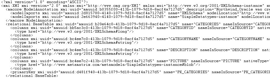 In Teiid Designer, models are used to define the entities, and relationships between those entities, required to fully define the integration of information sets so that they may be accessed in a uniform manner, using a single API and access protocol. The file extension used for these models is '.xmi' ( Example: NorthwindOracle.xmi ) which adheres to the XMI syntax defined by the OMG.