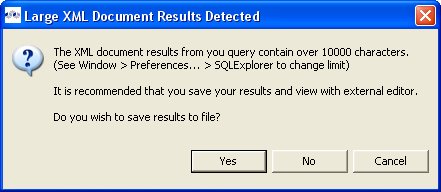 In addition, this file save dialog is presented to the user when the XML Document results exceed the character size limit defined by a user preference property for the SQL Explorer.