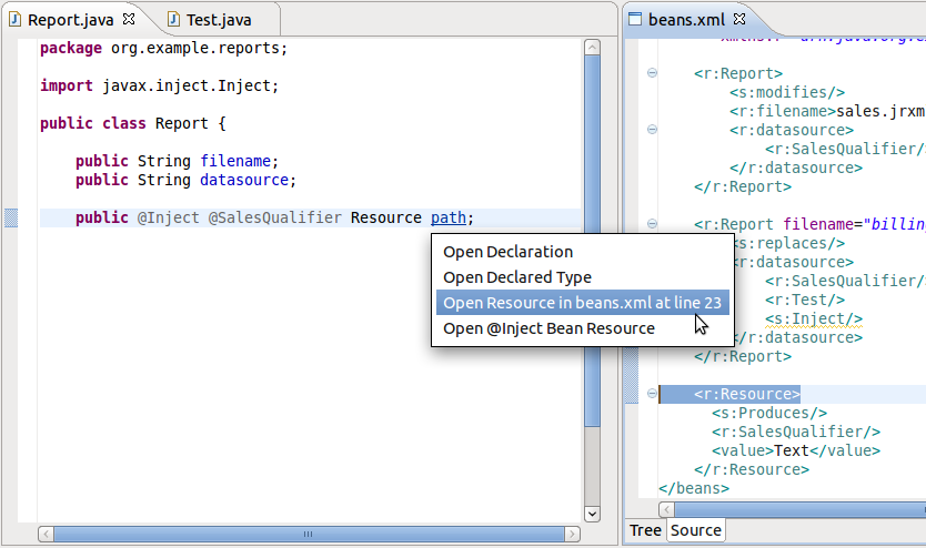 Beans injected into java source files and declared in Seam Config XML can now be navigated to via OpenOn.
